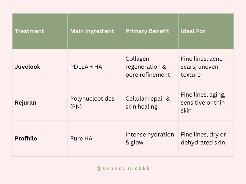 If your goal is firmer, smoother skin with improved structure, Juvelook is often the most effective choice. For signs of aging, sensitive or post-acne skin, Rejuran may be more suitable, while Profhilo shines for pure hydration and radiance.